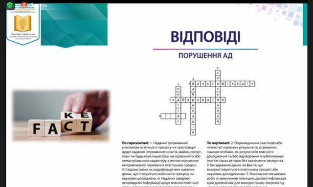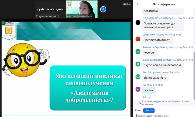 Семінар провела Анастасія Котелевець, голова Наукового товариства Факультету психології, соціальної роботи та спеціальної освіти, викладач кафедри соціальної педагогіки та соціальної роботи, яка актуалізувала знання учасників заходу щодо змісту поняття «академічна доброчесність»; окреслила основні види відповідальності за порушення правил академічної доброчесності; осередила увагу на нормативно-правовій базі, зокрема «Положенні про академічну доброчесність науково-педагогічних, наукових, педагогічних працівників та здобувачів вищої освіти Київського університету імені Бориса Грінченка»; узагальнила отримані студентами знання завдяки інтерактивному кросворду «Порушення АД».