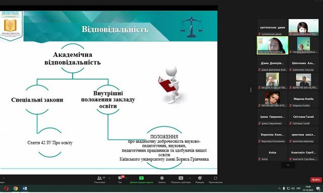23 жовтня 2023 року рамках школи академічної доброчесності Київського університету імені Бориса грінченка на Факультеті психології, соціальної роботи та спеціальної освіти відбувся Інтерактивний семінар «Академічна доброчесність під час написання курсових та бакалаврських робіт».