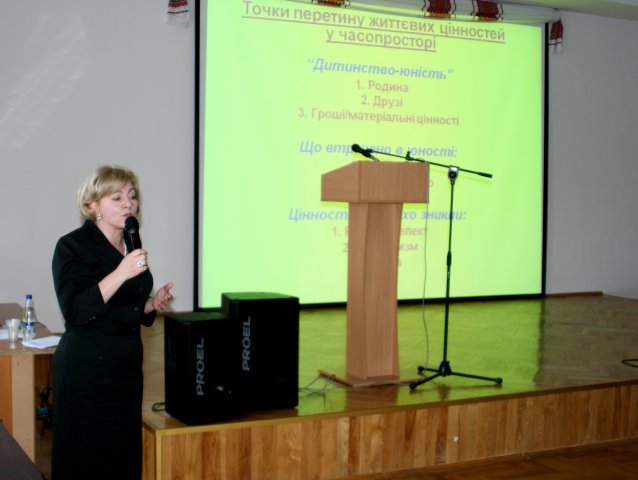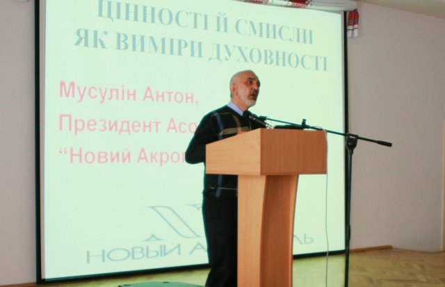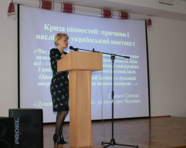З науковими доповідями виступили: старший викладач кафедри філософії Гуманітарного інституту Київського університету імені Бориса Грінченка, кандидат філософських наук Н.І.Семчук (доповідь “Криза цінностей: причини і наслідки: український контекст”); Президент Асоціації “Новий Акрополь” в Україні А.Мусулін (“Цінності й смисли як виміри духовності”); виконавчий директор ГО “Український наукових клуб” Н.І.Шульга (“Роль освіти у подоланні кризи цінностей”); заступник директора з наукової роботи Педагогічного інституту Київського університету імені Бориса Грінченка, кандидат педагогічних наук, доцент Г.В.Бєлєнька (“Трансформація цінностей у часопросторі “дитинство – юність”); психолог, професійний коуч, засновник та керівник Центру розвитку чоловіка і жінки “Епоха” А.Валенса (“Чоловіки та Жінки – конкурувати чи співпрацювати? (про хибні орієнтири сучасності)”); молодший науковий співробітник лабораторії психології мас та спільнот Інституту соціальної та політичної психології НАПН України В.Ю.Вінков (“Особливості сприймання громадсько-політичної інформації молоддю”); студентка І курсу спеціальності “Журналістика” Гуманітарного інституту Київського університету імені Бориса Грінченка Л.Нестеренко (доповідь “Ціннісно-смислові орієнтири студентів-грінченківців”).
