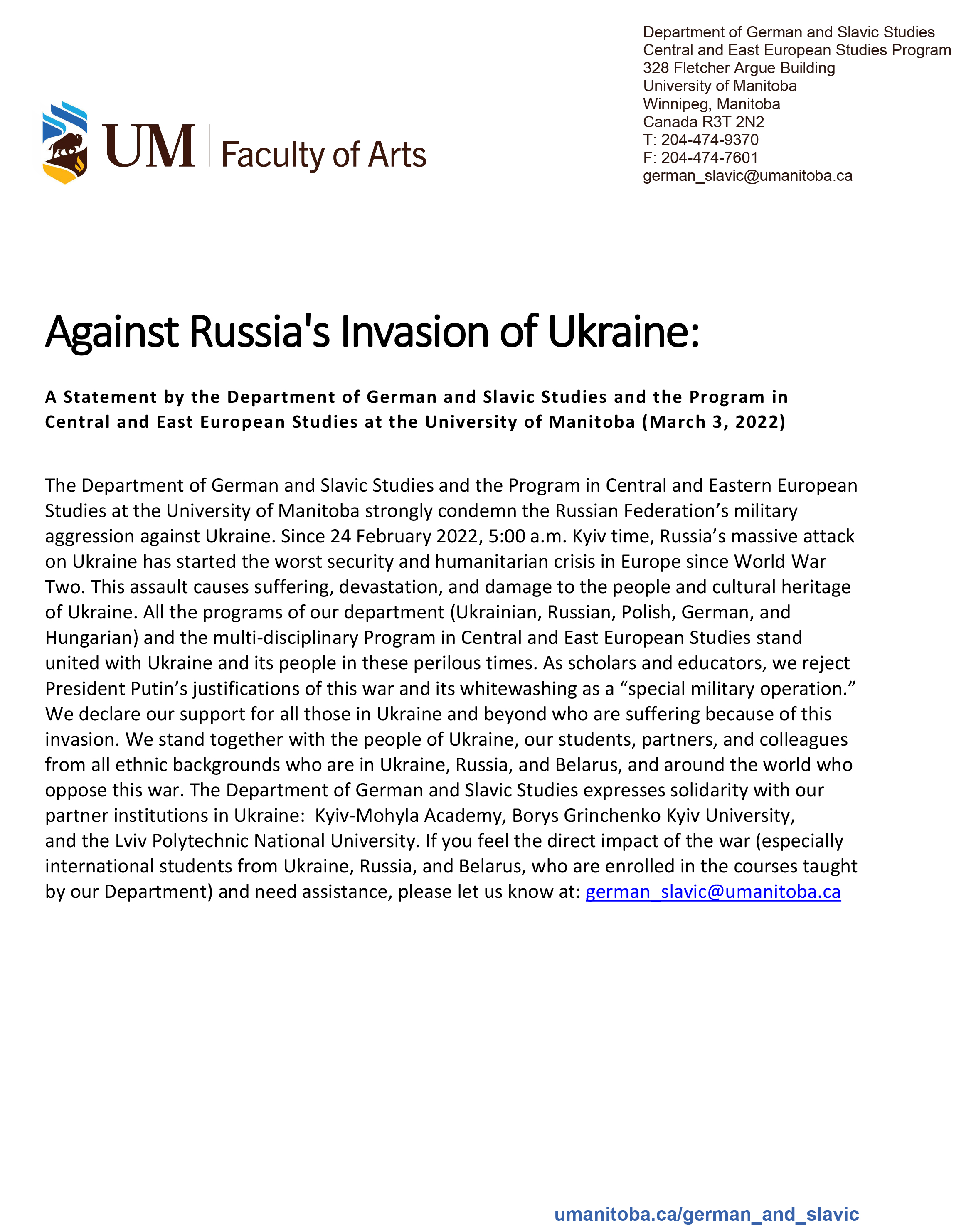 Against Russia's Invasion of Ukraine: A Statement by the Department of German and Slavic Studies and the Program in Central and East European Studies at the University of Manitoba (March 3, 2022)