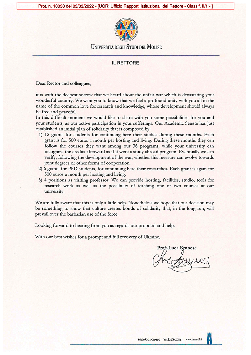 У той же час ми гарантуємо, що зробимо все можливе для повної підтримки нашої співпраці. За нинішніх обставин ми також хотіли б запевнити, що готові запропонувати будь-яку необхідну допомогу. Будь ласка, інформуйте нас на постійній основі, як і чим ми можемо бути корисними для вас. Зі свого боку ми докладемо максимум зусиль, щоб ви продовжували брати участь у європейському та світовому академічному житті.