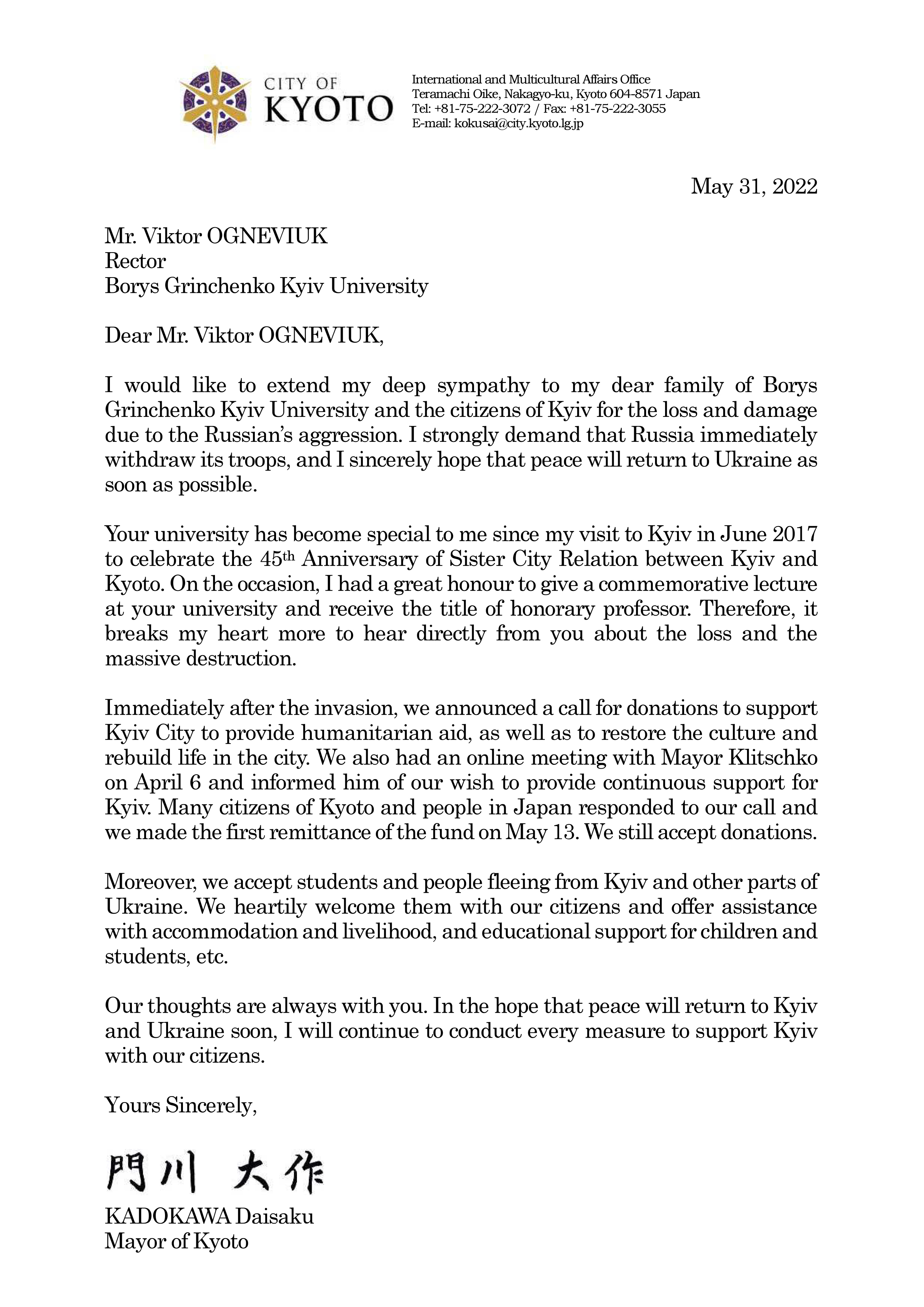 Ваш університет став для мене особливим після мого візиту до Києва в червні 2017 року під час святкування 45-ї річниці побратимських відносин між Києвом та Кіото. З цієї нагоди я мав велику честь прочитати лекцію у вашому університеті та отримати звання почесного професора. Тому мені особливо боляче чути безпосередньо від Вас про втрати та масові руйнування.