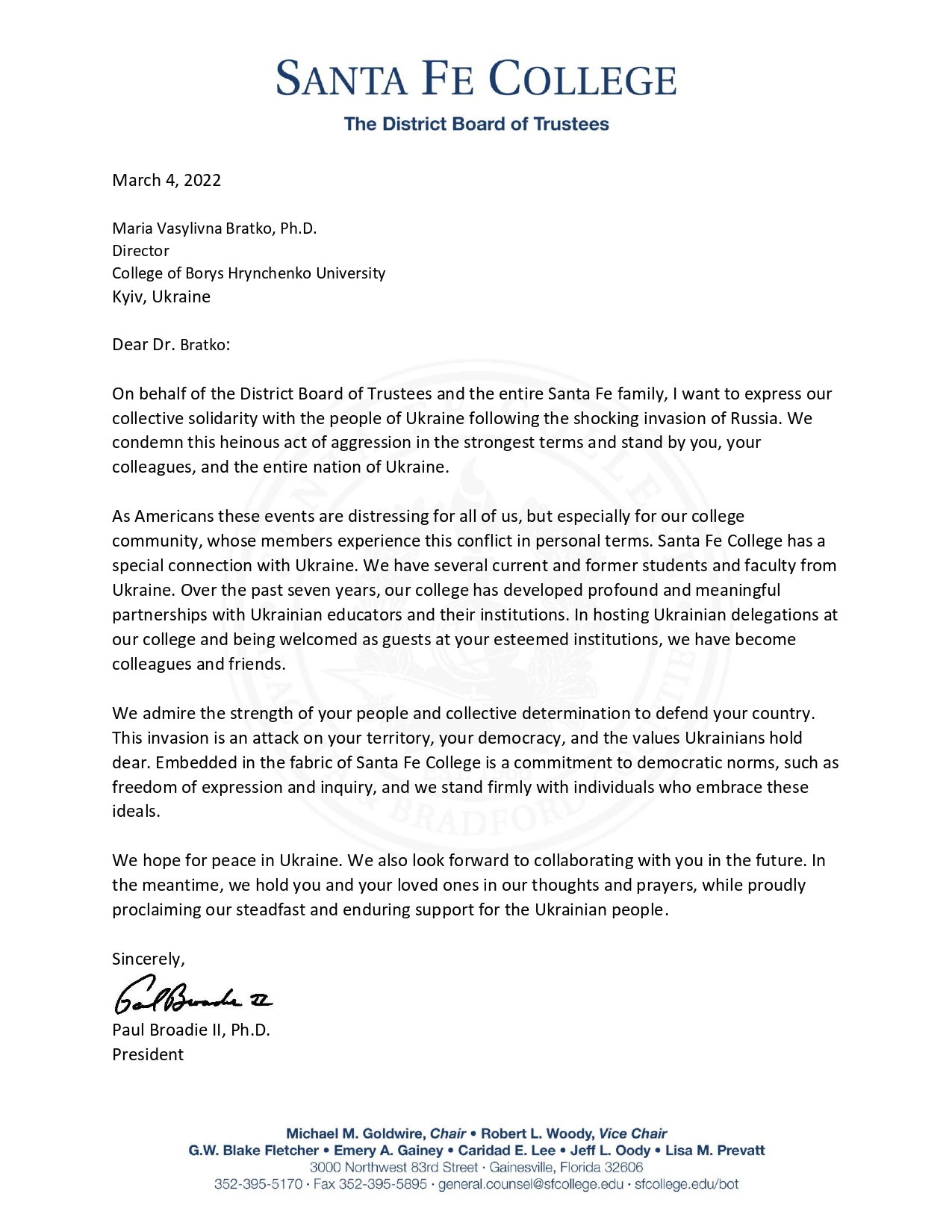 All of us in the United States have watched the news of Russia’s invasion of Ukraine in horror. We are very worried about how events are unfolding and, most critically, about the safety and well-being of our Ukrainian colleagues and friends. Please find attached a letter of support from the Santa Fe College President and Board of Trustees. Our thoughts and prayers are with you.