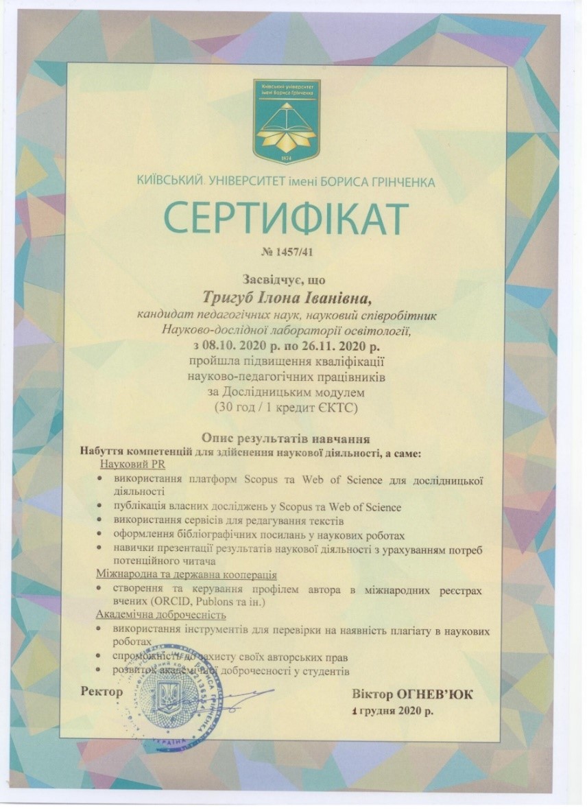 З 08.10.2020 по 12.11.2020 науковий співробітник НДЛ освітології Тригуб І.І. пройшла онлайн-курс підвищення кваліфікації «Інноваційні інструменти для дослідницької та публікаційної діяльності науковця» в межах програми Дослідницького модуля підвищення кваліфікації науково-педагогічних співробітників у Київському університеті імені Бориса Грінченка. Мета модуля – сформувати навички користування інформаційними ресурсами та сервісами для організації дослідницької та публікаційної діяльності науковця (web-платформи Scopus і Web of Science, сервіси перевірки текстів на плагіат, бібліографічні менеджери та ін.). Навчальне навантаження Дослідницького модуля становило 1 кредит ЄКТС (30 годин).