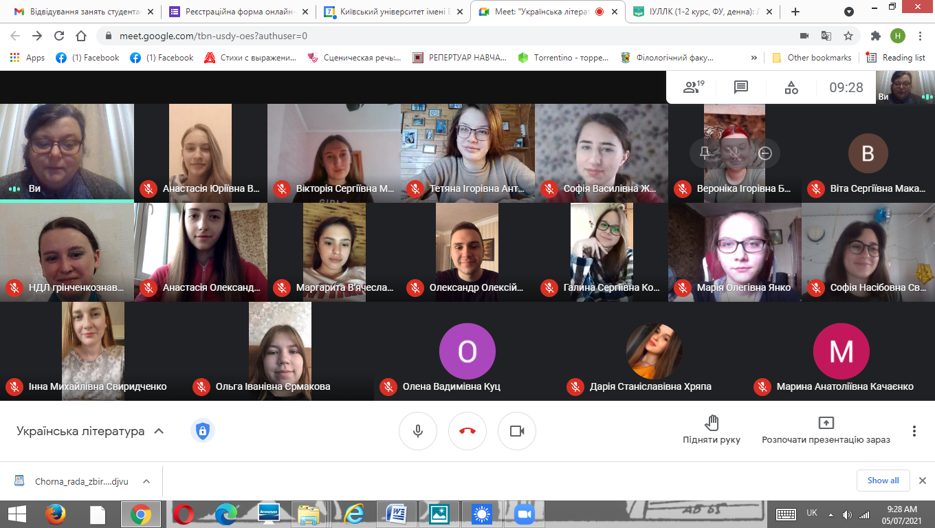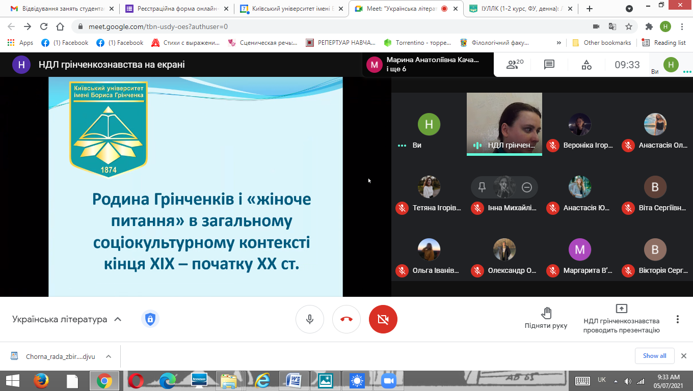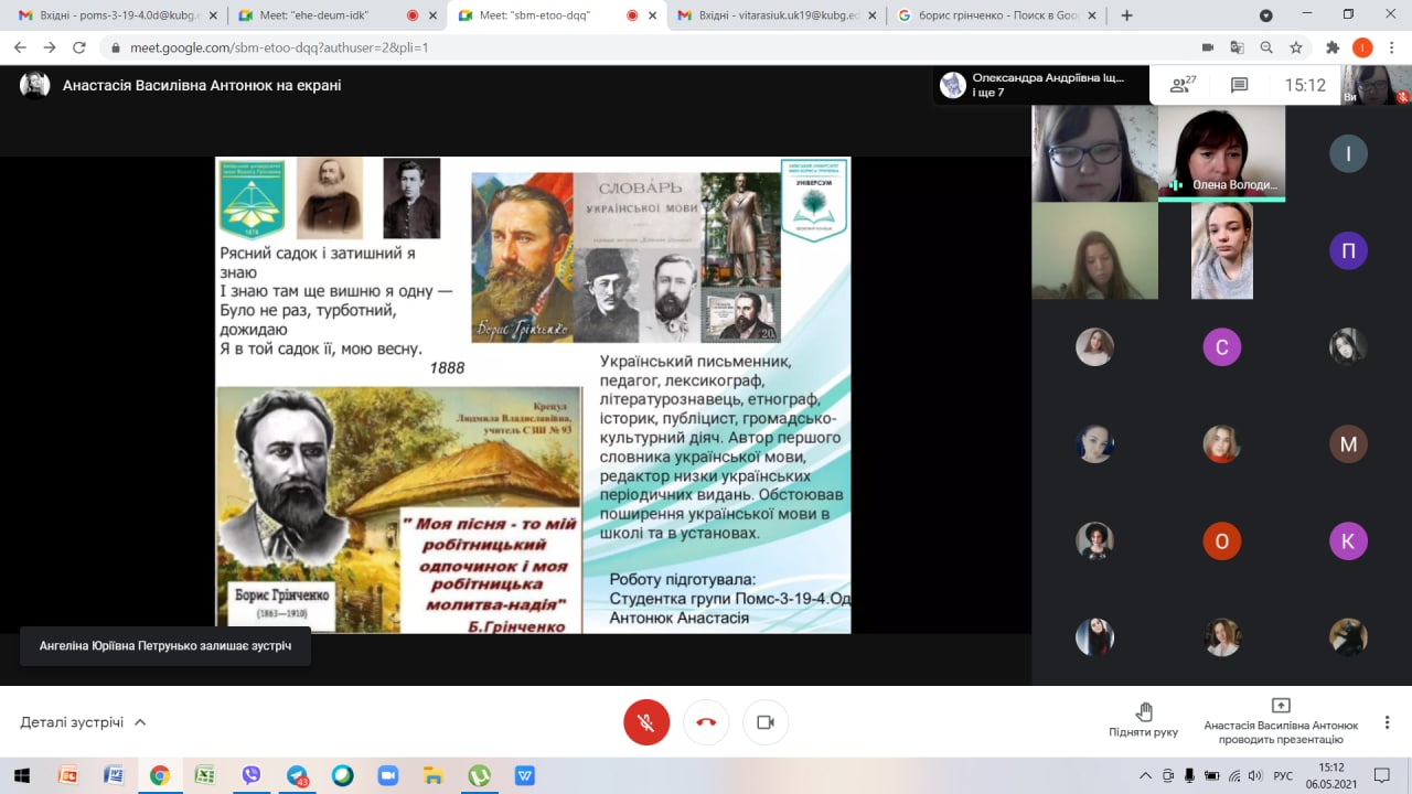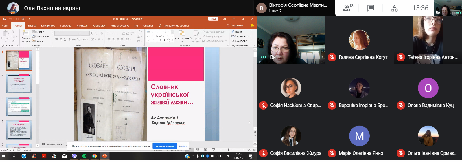 - тематичного онлайн-семінару «Творчість Бориса Грінченка крізь призму технологій комп’ютерної лінгвістики» (модератор – Горохова Т.О., кафедра української мови);