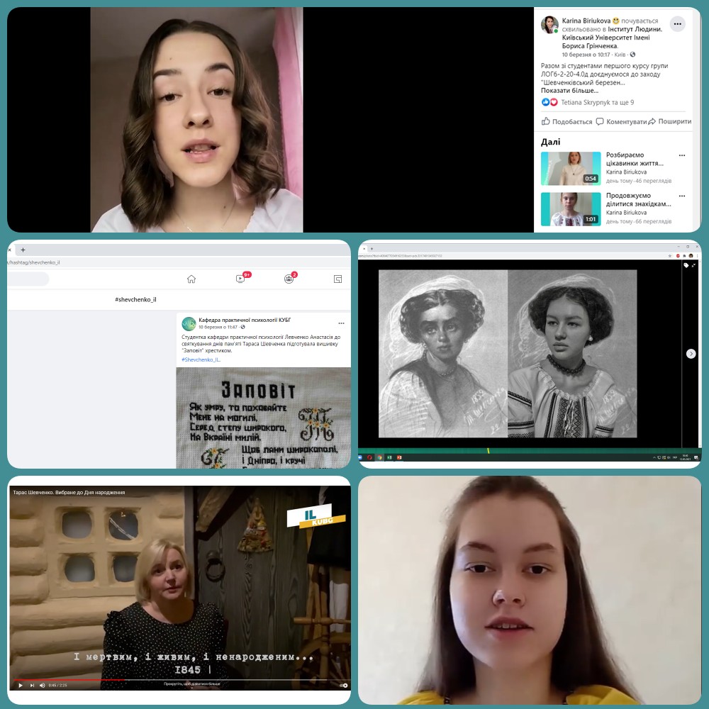 «Шевченківський березень» в Інституті людини розпочато з онлайн - флешмоба, метою якого було декламування віршів Т. Шевченка. У соціальних мережах лунали вірші: «Якби зустрілися ми знову», «У нашім раї на землі", «Заповіт», «Садок вишневий коло хати», «І мертвим, і живим, і ненарожденним землякам моїм в Украйні і не в Украйні моє дружнєє посланіє», «Княжна», «І тут, і всюди – скрізь погано» та ін. Далі відбулась вікторина «Життя та творчість Т. Г. Шевченка». До днів пам'яті Тараса Шевченка студенти ІІ курсу спеціальності «Практична психологія» підготували відео-презентацію "Психологія у творчості Тараса Шевченка". Було проаналізовано такі твори Тараса Григоровича Шевченка, як «Художник», «Мені тринадцятий минало», «Думи мої, думи», «Доля». Окреслено психологічні проблеми самотності, внутрішнього конфлікту, дорослішання, морального вибору, які висвітлювались письменником у творах. Студенти ІІ курсу, спеціальності «Консультаційна психологія» провели рефлексивну онлайн арт-зустріч на тему: “Якби я був Шевченком Т.Г. зараз, то що б я зобразив із сучасної реальності? Що вартувало б моєї уваги, про що б я хотів написати?”, в рамках якої спробували ресурсно надихнутися психологічністю зображення української реальності письменником та усвідомити аспекти національної ідентичності через власне розроблений арт-продукт; актуалізувати больові точки національної свідомості та закцентувати увагу на ресурсних досягненнях сучасного стану молодої країни, що перебуває у стані розвитку. Спробували «вихопити» з українського колективного несвідомого за допомогою арт-техніки ментальні тенденції нації та знайти точки опори в сучасному її становленні… Протягом шевченківського березня студенти першого курсу спеціальності «Психологія» взяли участь у флешмобі «Шевченко в моєму серці». Для участі у заході необхідно було зробити селфі з «Кобзарем» і виставити його у соціальні мережі. Низку відеороликів про цікаві факти з життя та творчості Тараса Григоровича Шевченка відзняли студенти І курсу спеціальності «Спеціальна освіта». Особливістю цьогорічного «Шевченківського березня» стала сучасна картинна галерея, де студентки ІІ курсу уявляли себе героїнями найвідоміших картин Кобзаря.