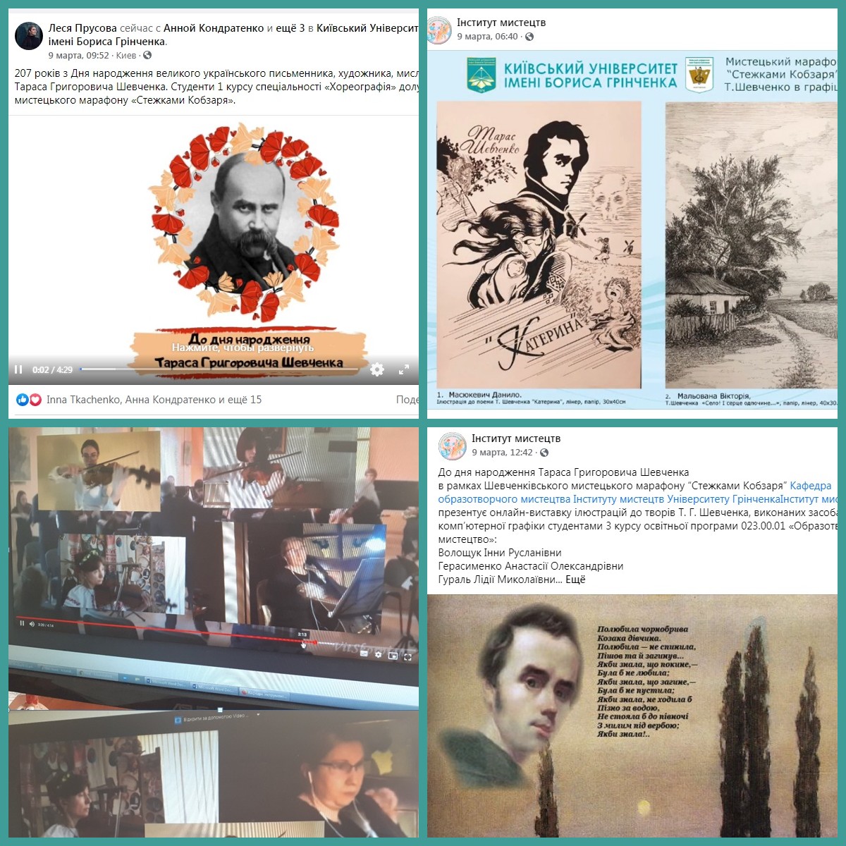 Викладачі кафедри образотворчого мистецтва та дизайну за активної участі студентів Інституту мистецтв до Шевченківського березня створили онлайн-виставки: «Образи Т. Г. Шевченка в графіці» та ілюстрацій до творів Т.Г.Шевченка, виконаних засобами комп’ютерної графіки. Кафедра академічного та естрадного вокалу підібрала матеріал процікаві факти з життя Т.Г.Шеченка для сторінки кафедри у Facebook. Співробітники Навчальної лабораторії виконавської майстерності відзняла відеоролик за участю камерного оркестру «Я.Степовий «Прелюд пам'яті Т.Шевченка» .У соціальних мережах було проведено мистецький марафон «Стежками Кобзаря». Студенти І курсу спеціальності «Хореографія» та викладачі кафедри хореографії стали авторами відеопроєкту на вірші Т.Г.Шевченка.