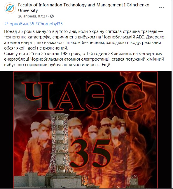 На Факультеті інформаційних технологій та управління проведено кураторські години з переглядом фільмів про чорнобильську катастрофу, розміщено тематичну інформацію на сайті факультету та соцмережах.