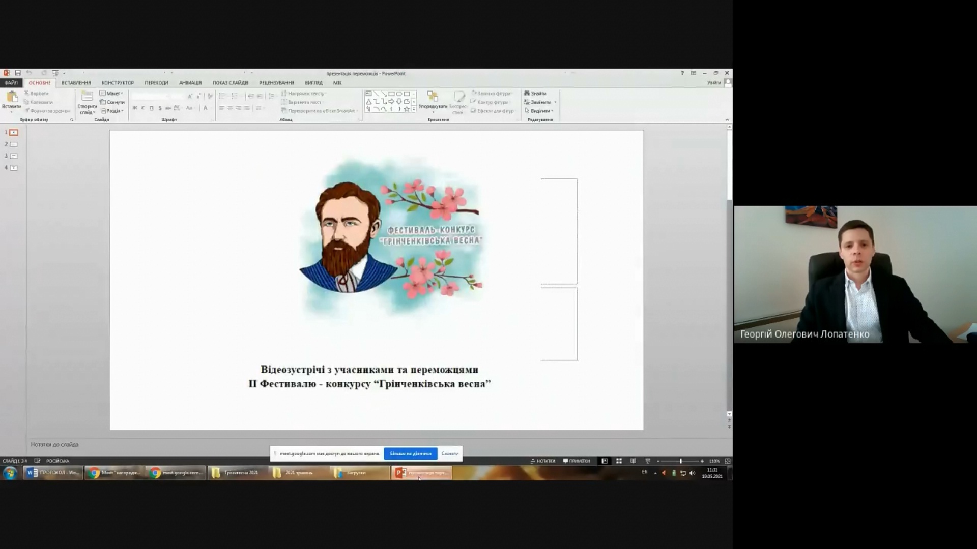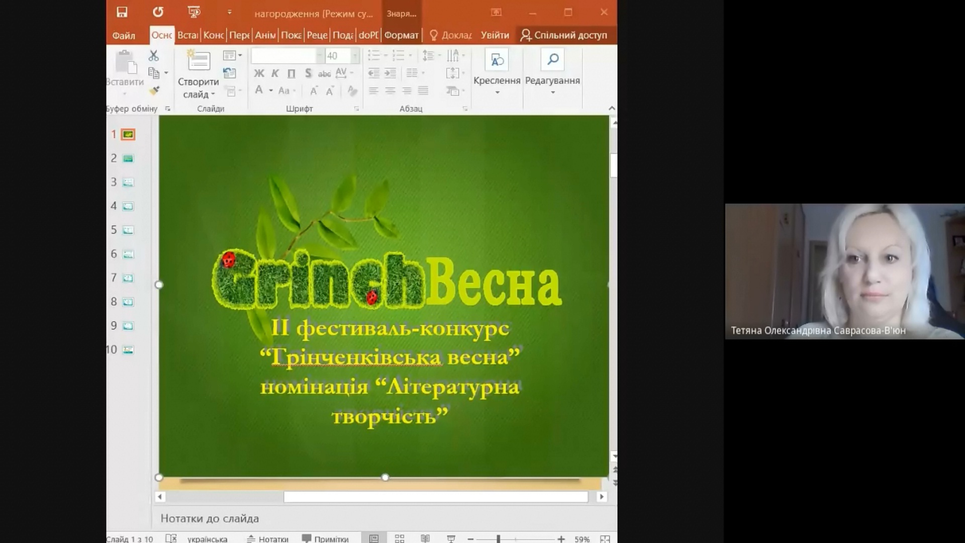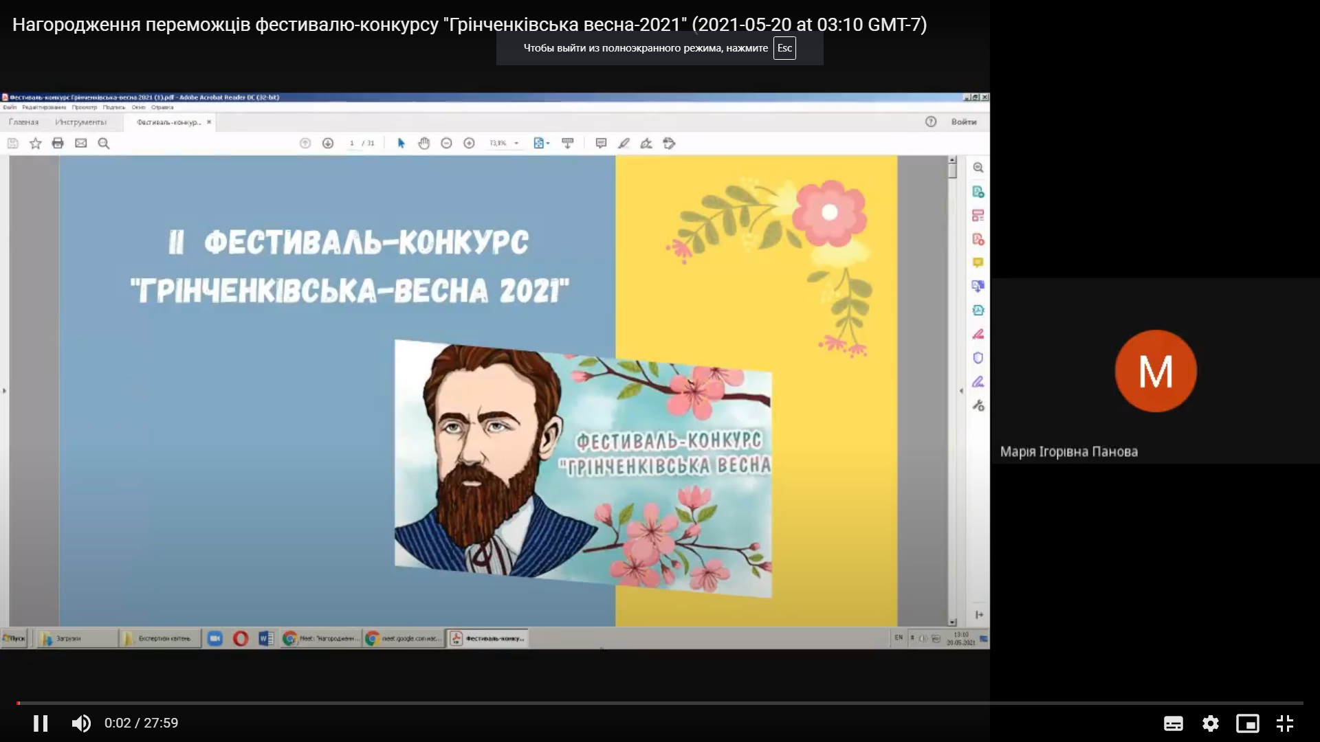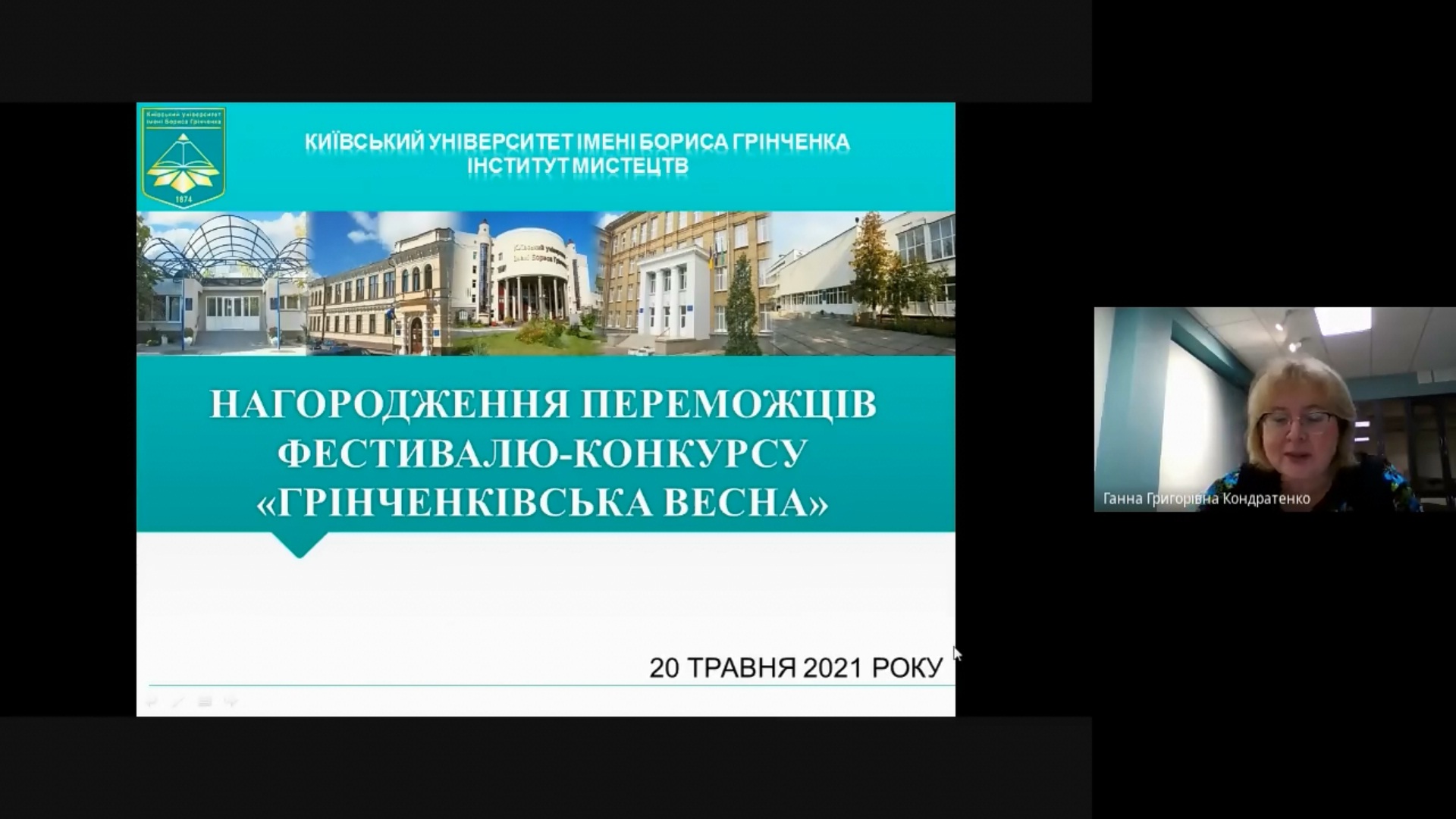 Неможливо здобути перемогу без кропіткої роботи, титанічних зусиль, терпіння. Беззаперечним підтвердженням цієї істини став Фестивалю-конкурс «Грінченківська весна», який тривав з 12 квітня по 14 травня у Київському університеті імені Бориса Грінченка. Лауреатами конкурсу стали найнаполегливіші, найталановитіші, найкреативніші його учасники. Це зауважили члени професійного журі під час онлайн церемонії нагородження. Всі конкурсанти отримали дипломи учасників, а переможці – дипломи першого, другого та третього ступенів.