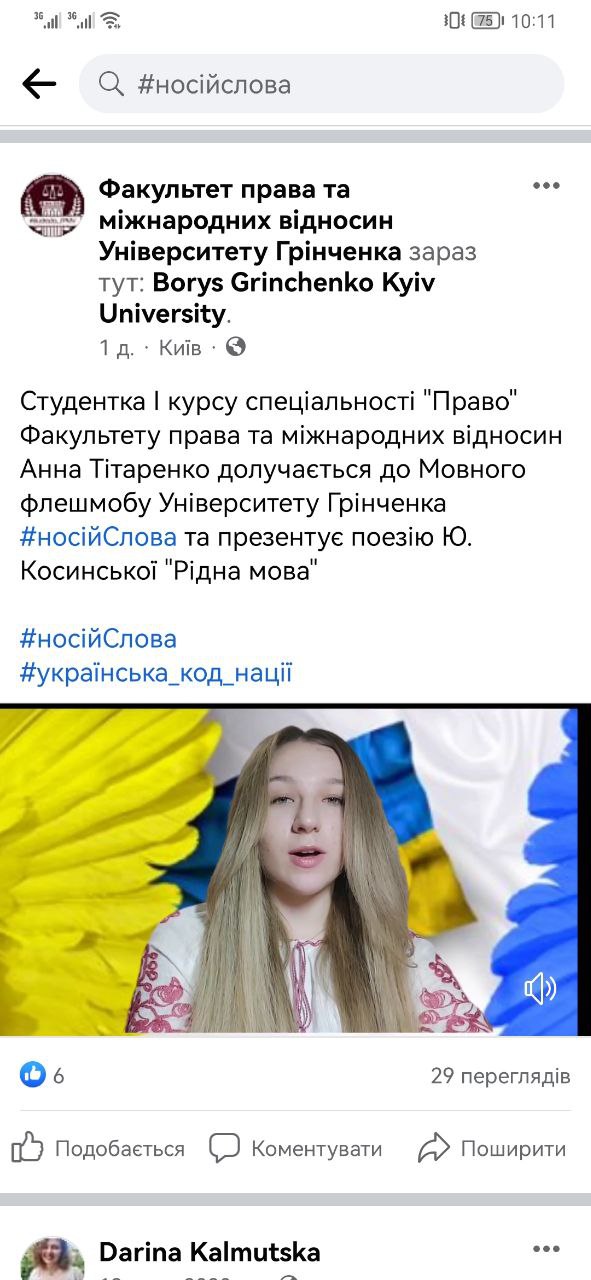 Студенти, викладачі, співробітники Університету Грінченка взяли участь у Загальноуніверситетському мовному флешмобі #носійСлова та доєдналися до Національно-патріотичного проєкту #Українська_код_нації. Учасники записували відео декламування улюблених поезій, прозових творів, написаних українською мовою, та розміщали у соціальних мережах. Заходи організовано у рамках відзначення Дня української писемності та мови.