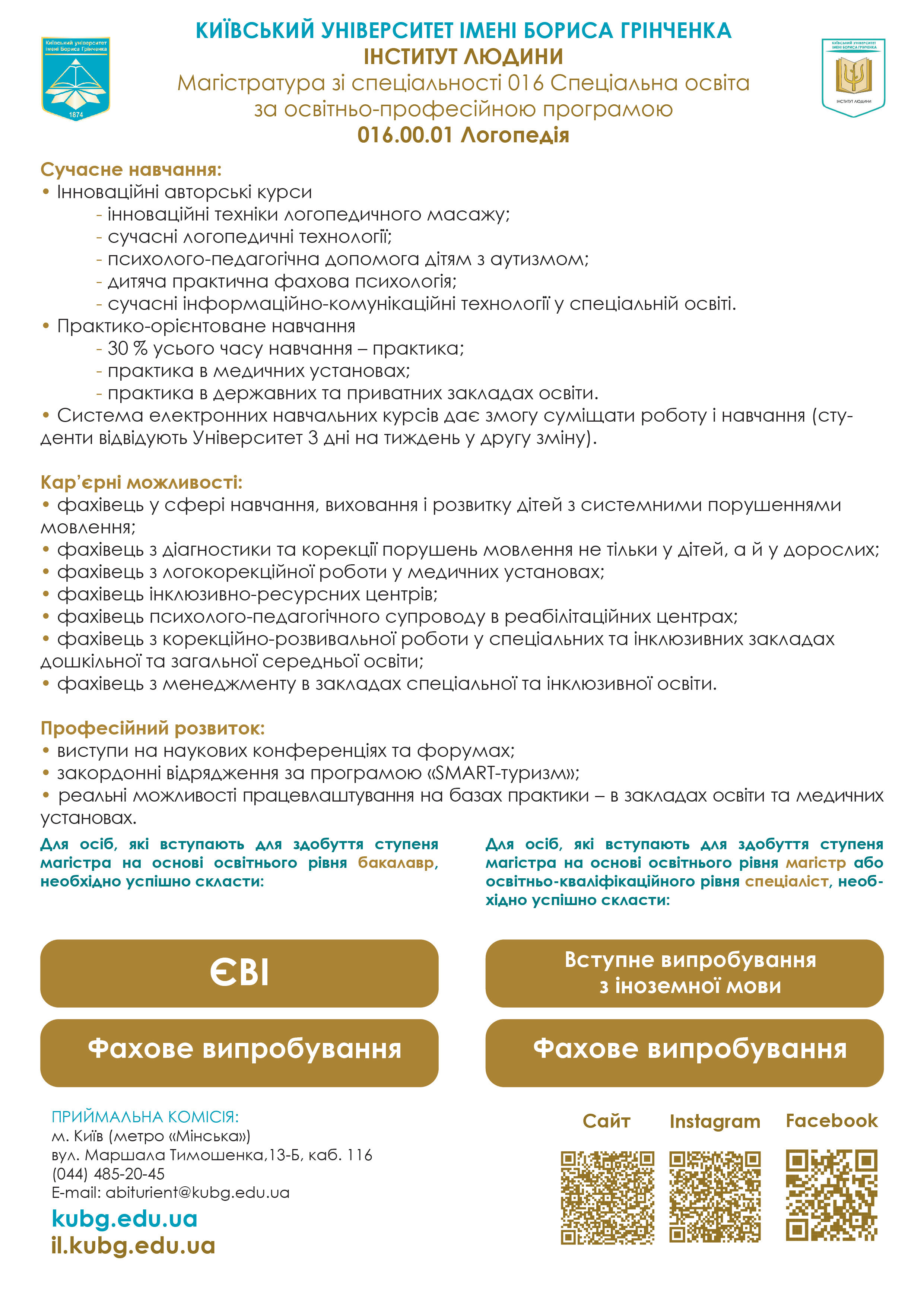 Київський університет імені Бориса Грінченка пропонує магістерську освітньо-професійну програму зі спеціальності 016.00.01 Логопедія