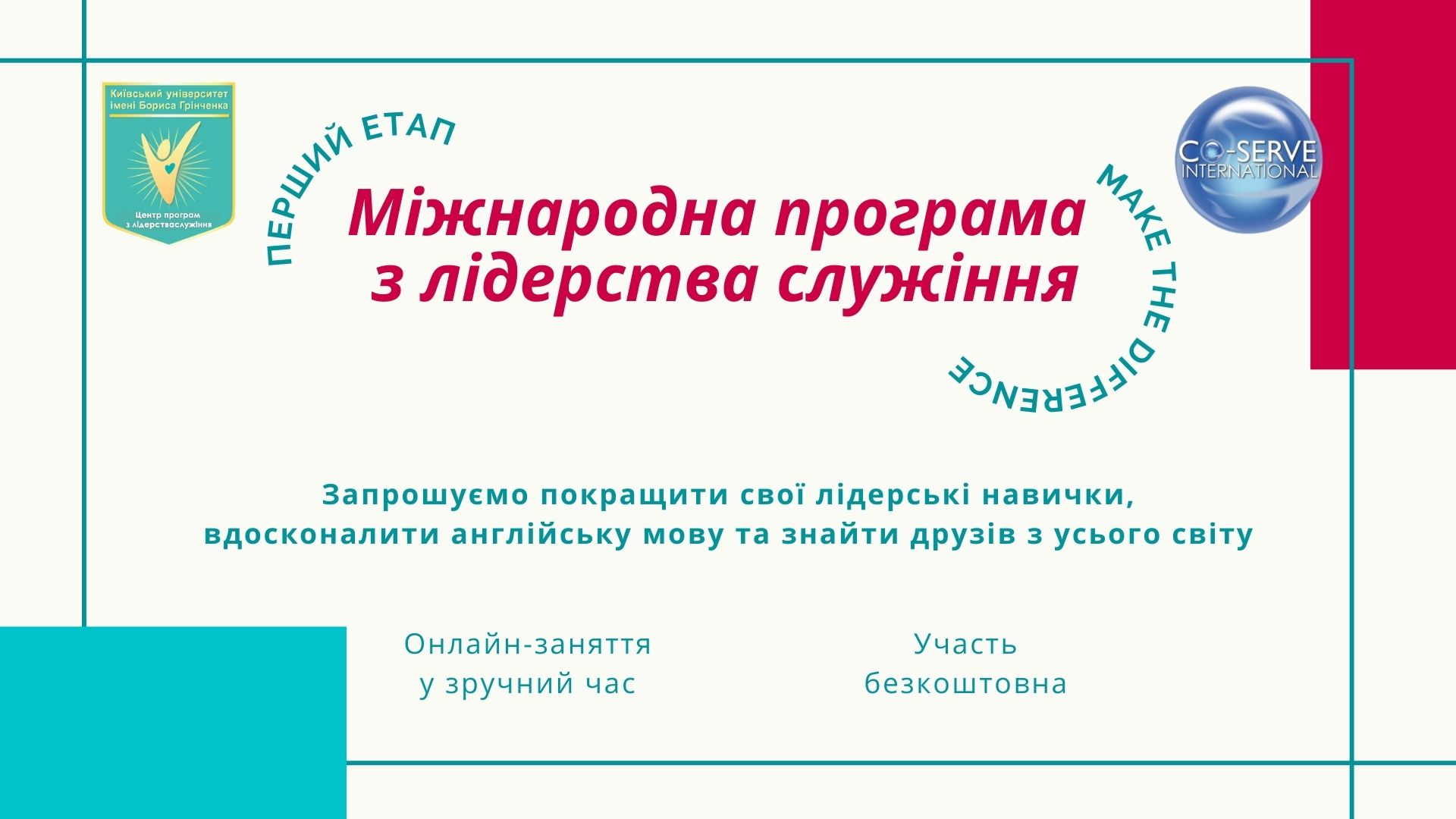 Центр програм з лідерства служіння запрошує долучитися до щорічної англомовної програми з розвитку лідерських якостей у співпраці з міжнародною організацією «Co-Serve International», яка відбудеться з 18 жовтня по 12 листопада.