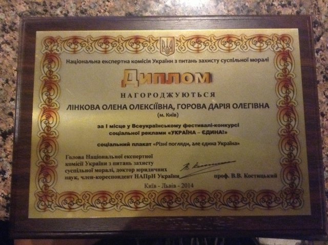 27 вересня 2014 року у місті Львові відбулась церемонія нагородження переможців Всеукраїнського фестивалю-конкурсу соціальної реклами «УКРАЇНА – ЄДИНА!», ініційованого Національною експертною комісією України з питань захисту суспільної моралі спільно з Львівською міською радою.
