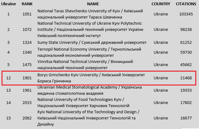 Порівняно з липневим випуском 2019 року Київський університет імені Бориса Грінченка у липні 2020 року посів 12 місце серед 61 університетів України, представлених у рейтингу. Серед університетів світу Університет Грінченка піднявся на 481 позицію та посів 1901 місце, загальна кількість цитувань збільшилась на 2711 та склала 21468.