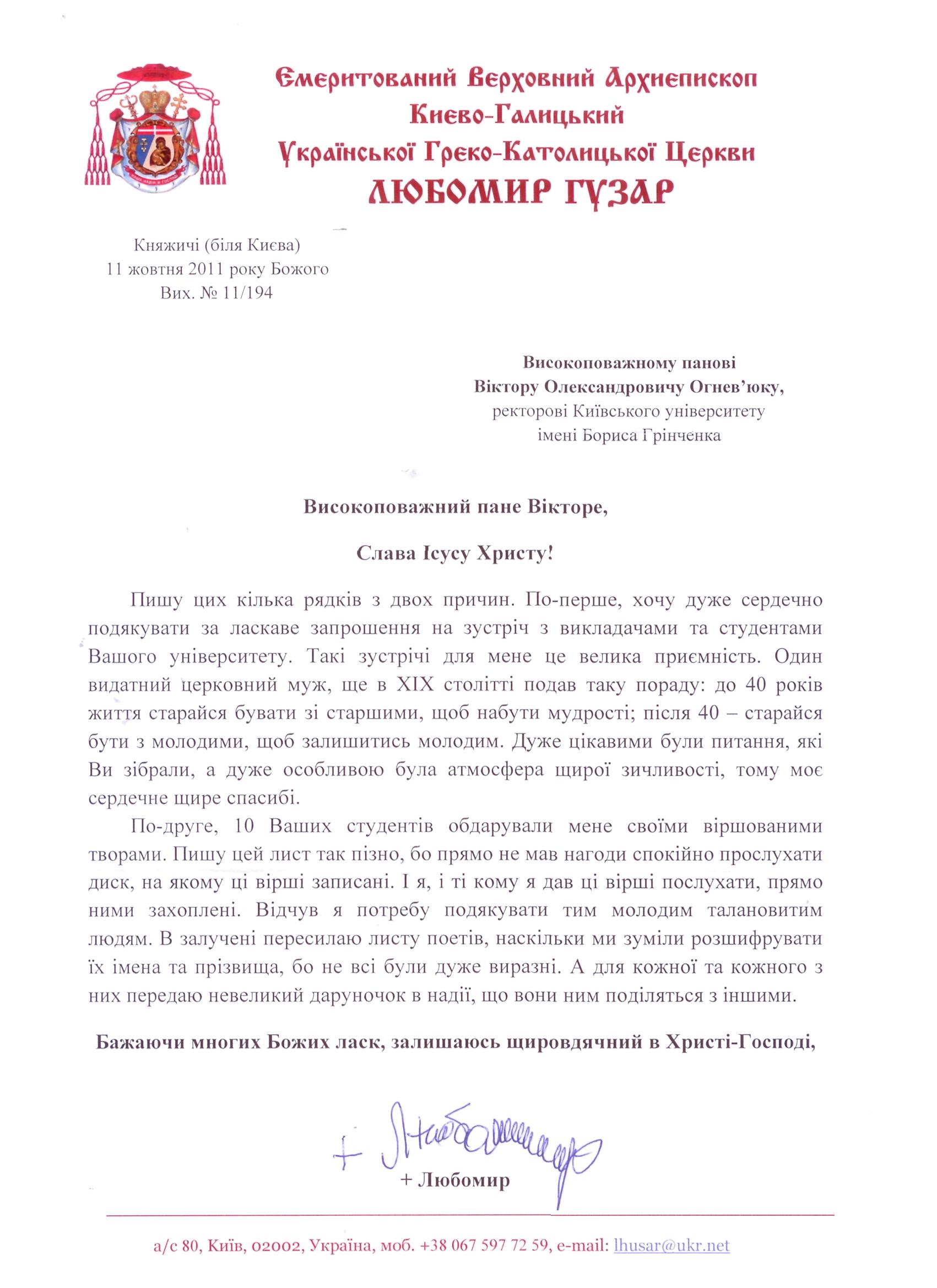 Лист-подяка від Емеритованого Верховного Архиєпископа Києво-Галицького Української Греко-Католицького Церкви Любомира Гузара