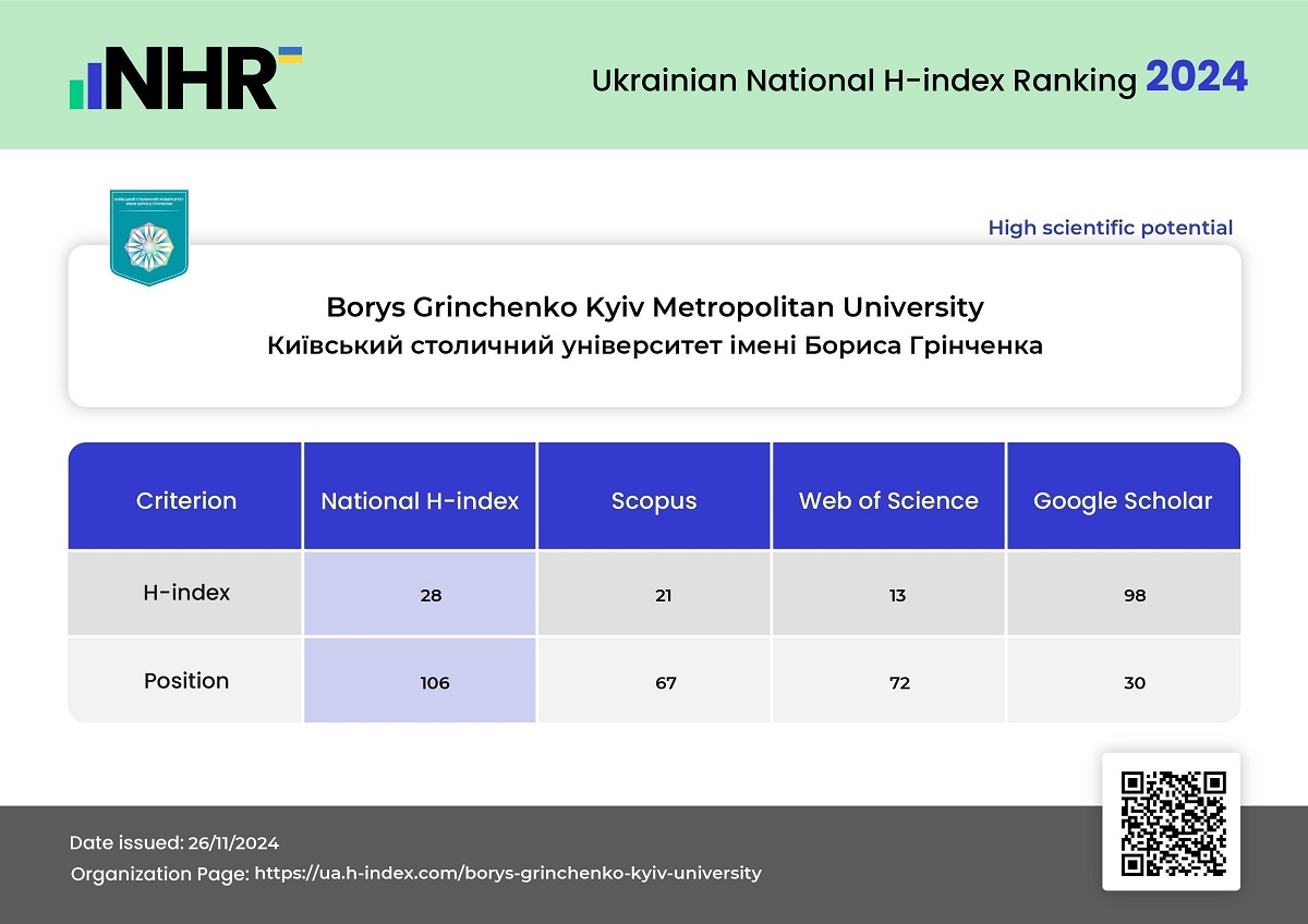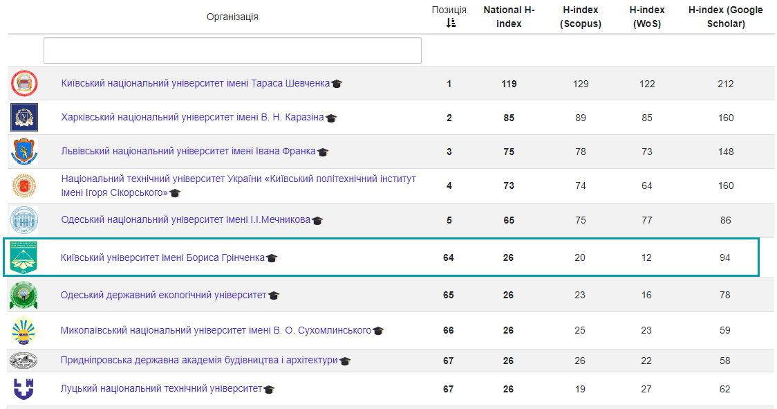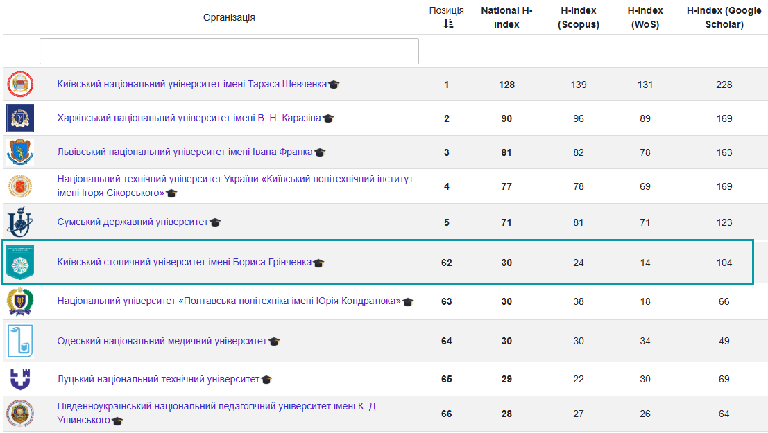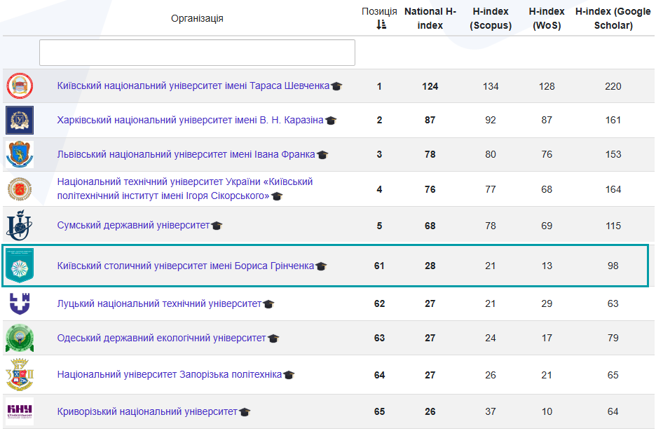З рейтинговими списками науковців Київського університету імені Бориса Грінченка за показниками індексу Гірша в Scopus та Google Scholar можна ознайомитись за посиланням.