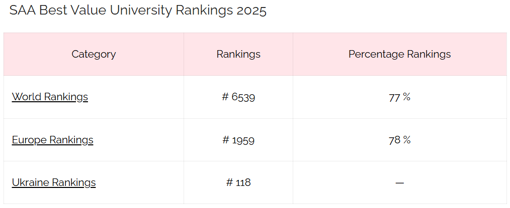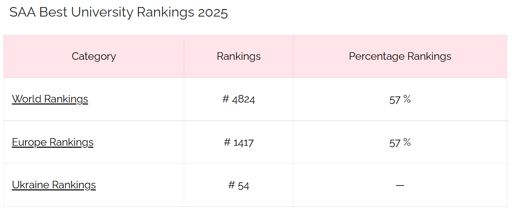Study Abroad Aide - міжнародний освітній рейтинг, орієнтований на іноземних студентів, який ранжує заклади вищої освіти на основі комплексного показника, яких включає оцінювання академічної репутації, вартості навчання та можливостей для іноземних студентів. Дані для рейтингу отримуються з офіційного вебсайту університету.