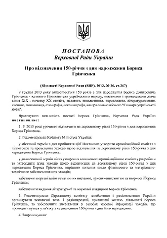З наближенням 150 річного ювілею Бориса Грінченка 4 липня 2012 року Верховною Радою України було ухвалено Постанову «Про відзначення 150-річчя з дня народження Бориса Грінченка».