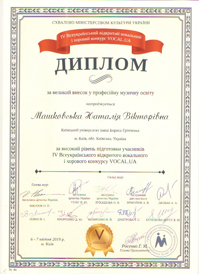 6-7 квітня 2019 року у Києві відбувся IV Всеукраїнський відкритий вокальний і хоровий конкурс «Vocal.UA». У роботі фестивалю брали участь керівник загальноуніверситетської вокальної студії Наталія Машковська та її вихованці – студентки Інституту філології Олександра Лихота та Регіна Пилипенко.