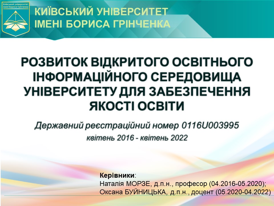 В процесі реалізації завдань наукових розробок в Університеті створено відкрите освітнє інформаційне середовище, в якому впроваджуються: